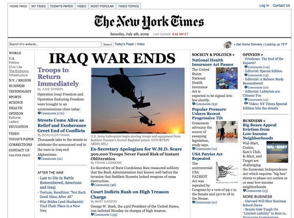 Thanks to dear friend Lori Gold for turning me on to this “perfect World” NY Times dream front page. Incredibly detailed and reproduced down to the last detail with working links and click-through stories…This is totally righteous! And thanks to Lori’s cousin, Emily, who teaches architecture at Parsons and participated in the project. See the full-size version here.
