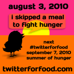 Thanks to everyone who supported @TimBlair and his monthly “TwitterForFood” campaign. Thousands skipped a meal and donated the savings to fund their local food bank yesterday! The web site reports that they added some new food banks – check them out by state under “Food Banks and World Hunger Links” in the column on the right of the page. Join the movement – As Tim says, “If 100 million twitterers each gave five dollars, we could end hunger!”